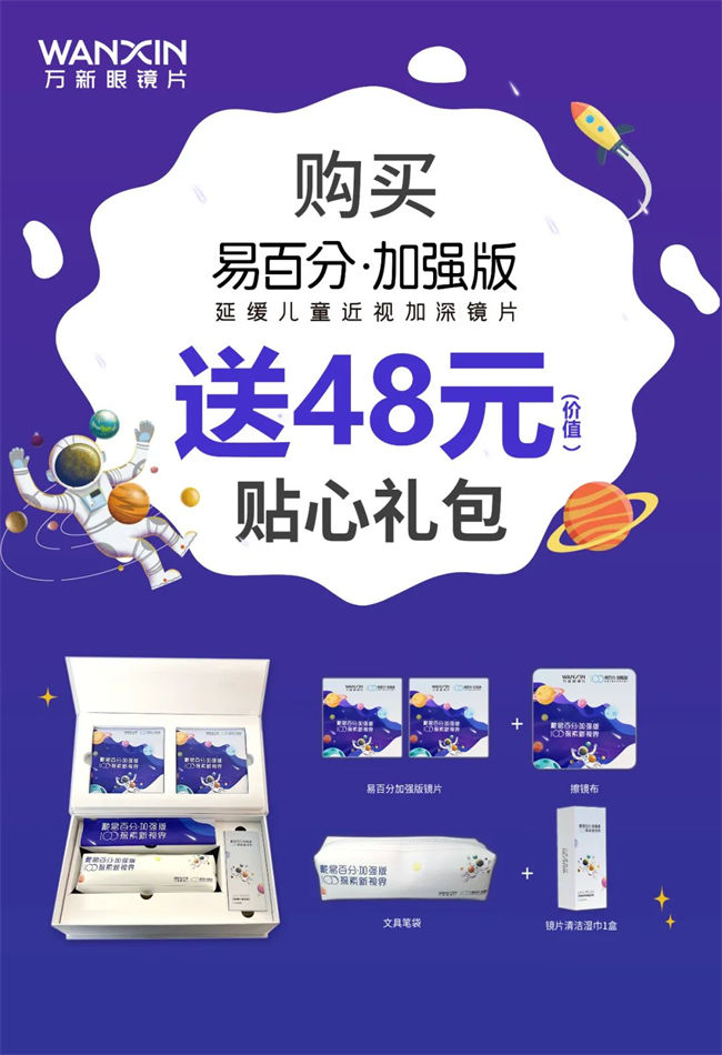 現(xiàn)在購易百分·加強(qiáng)版鏡片,就送價(jià)值48元貼心大禮包哦!內(nèi)含一副鏡片、擦鏡布、文具筆袋與鏡片清潔濕巾,實(shí)用性與顏值都是滿分!你還在等什么?快去附近門店咨詢,了解詳情吧~